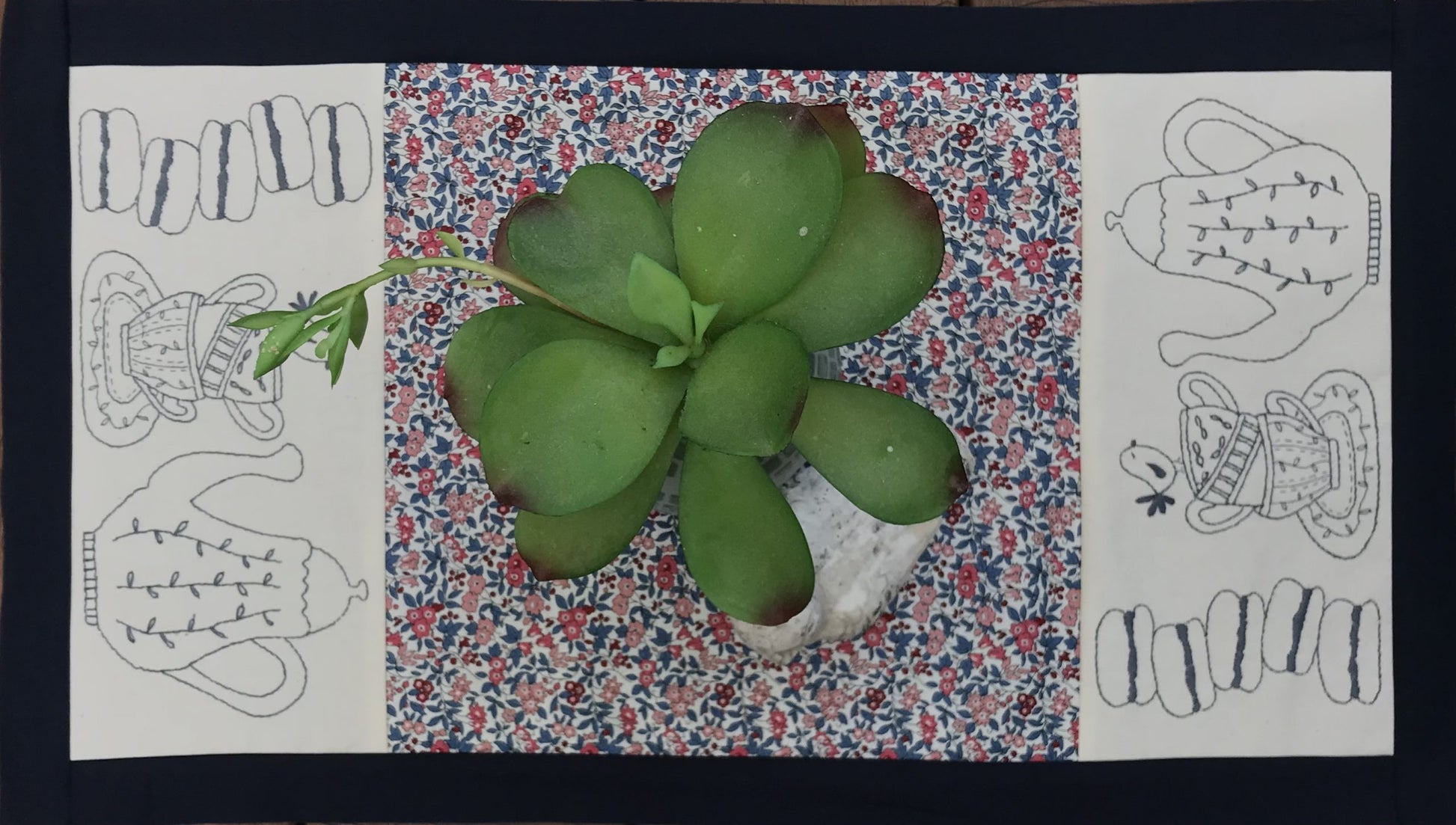 This includes the pattern, iron on transfers, threads and fabrics to complete the top of this runner. It measures 14” x 25”.